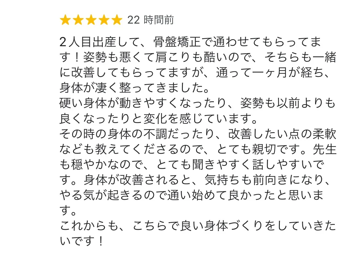 出産後、女性の体にはさまざまな変化が現れます。その中でも特に重要なのが骨盤の位置と形状です。出産時に骨盤は多くのストレスを受け、位置がずれたり、形が変わったりします。この影響で、腰痛や肩こり、さらには血行不良や内臓の位置異常が生じることがあります。これらの問題を解決するためには、産後の骨盤矯正が必要不可欠です。 整骨院で行う骨盤矯正は、専門の施術者による手技療法を用いて、骨盤を正しい位置に戻すことを目指します。これにより、正しい姿勢が自然と身につき、身体の不調が改善されていきます。実際に施術を受けた方の中には、腰痛が軽減したり、日常生活が快適になったといったポジティブな体験談が多数寄せられています。 産後の身体をしっかりとサポートし、健康的な日常を取り戻すために、早めの骨盤ケアが重要です。
